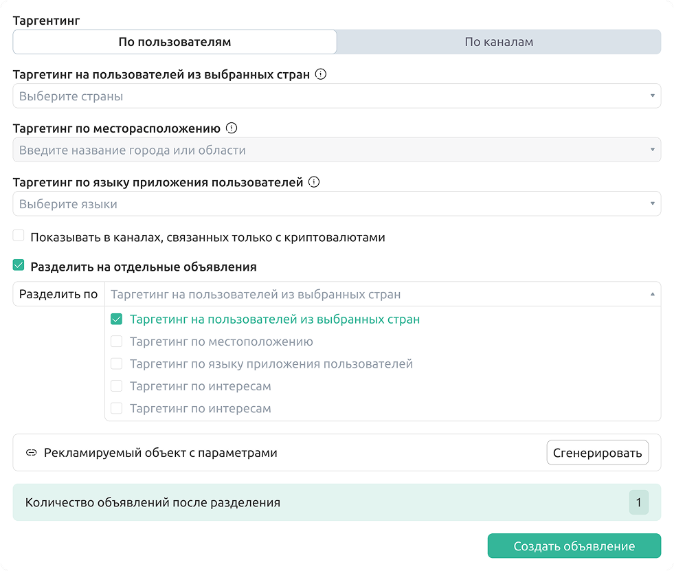 Мгновенно создавайте несколько рекламных объявлений по списку каналов или тематик, чтобы оценить эффективность каждого источника